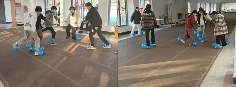 每隊四人,在腿上綁上四個氣球,通過踩氣球的方式,計時三分鐘剩余氣球多的獲勝,如果全部被踩爆則直接失敗。開局同學們還站在各自的“領地”,不敢發(fā)起進攻,隨著游戲的進行,場面愈發(fā)激烈。