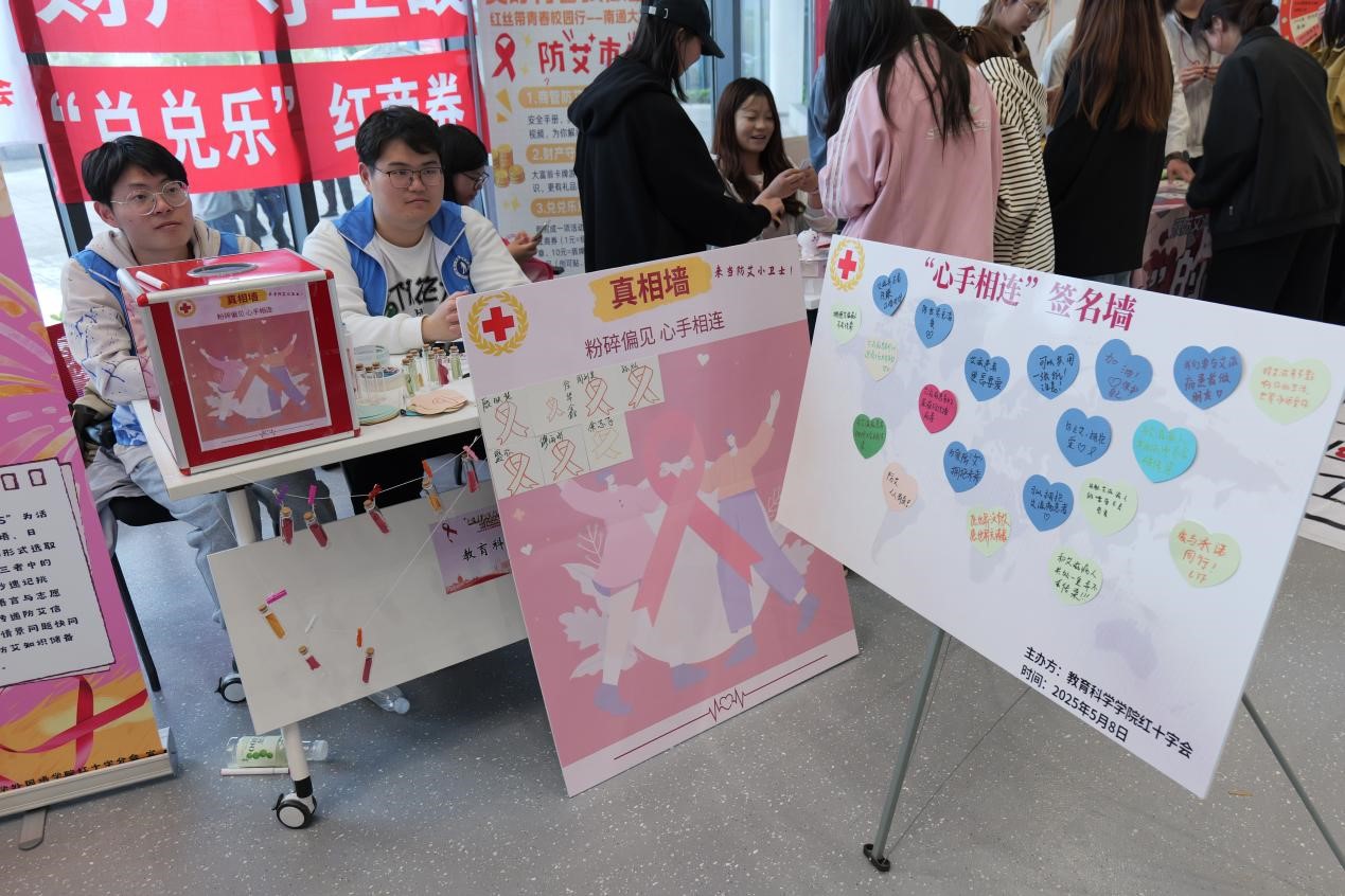 2025年5月8日,南通大學(xué)教育科學(xué)學(xué)院紅十字會(huì)在“美好青春我做主”紅絲帶青春校園行活動(dòng)中開展防艾攤點(diǎn),攤點(diǎn)設(shè)拼圖簽名墻、對(duì)話漂流瓶