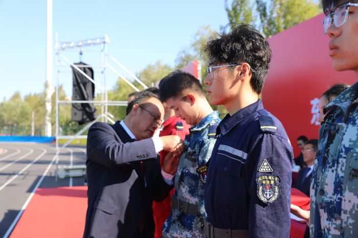在莊重的升旗儀式后,校黨委書記付曉飛為2025級新生代表佩戴校徽。在全體新生的注視下,付曉飛書記滿懷關(guān)切與期望,為同學(xué)們一一戴上象征榮譽與責(zé)任的;。一枚枚校徽在陽光下熠熠生輝,標(biāo)志著新生們正式成為東油大家庭的一員。這一刻,凝聚著師長的囑托與精神的傳承,連接著學(xué)校的輝煌歷史與美好未來。從此,2025級新生將書寫屬于自己的東油故事,鑄就獨特的東油魂。
