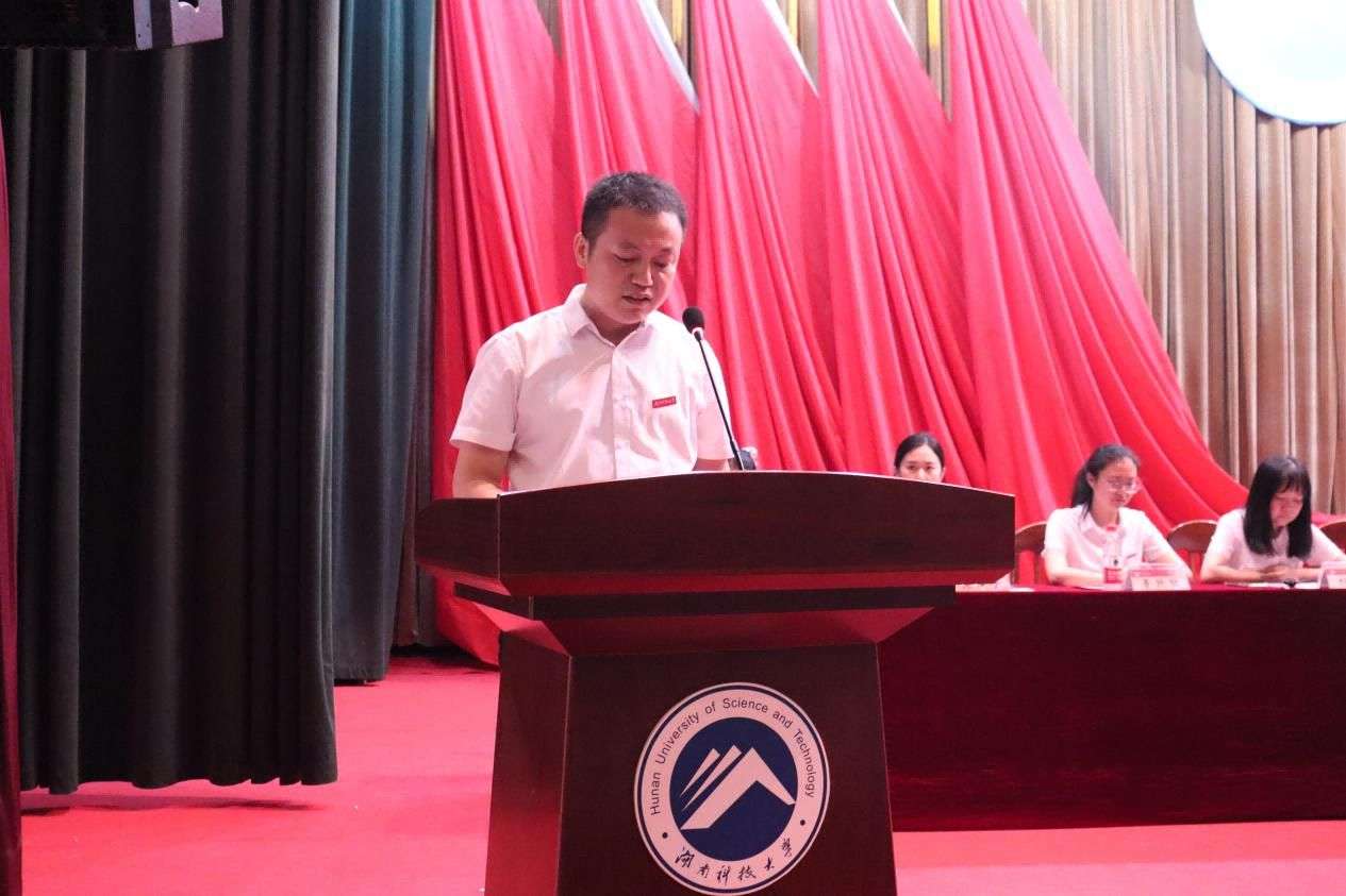 “偉人里,將帥鄉,莘莘學子聚八方。懷復興夢想,揣求知渴望……”2022級新生齊唱湖南科技大學校歌,將校歌中蘊含的科大精神傳遞到每位新生的心中。此次開學典禮在全體師生齊唱校歌中圓滿落幕。隨后,學院舉行新生入學教育大會,由學院副黨委書記劉輝亞進行主講。