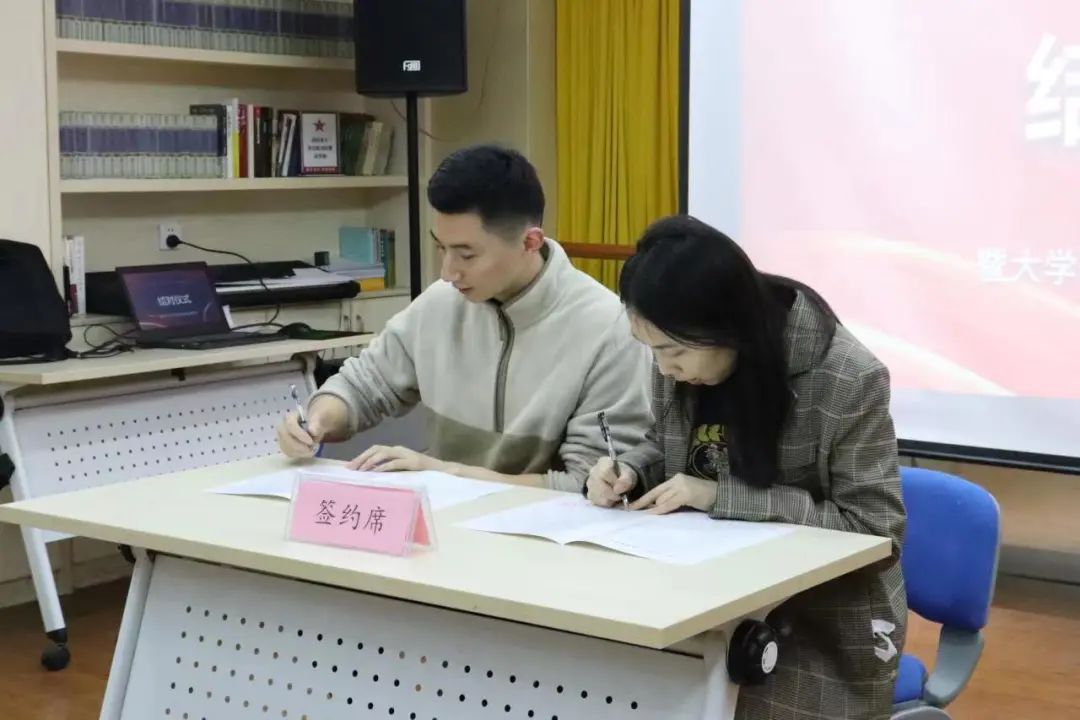 隨后,學院團委書記曹仲曄與晨光社區團支部書記吳媛紅上臺簽訂了大學生社會實踐基地協議書,共同完成了掛牌儀式,并合影留念。