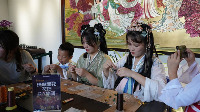 長條幾案上,拓板、宣紙、拓包、油墨等工具一應俱全,經過一系列繁雜的工序,一張張古風十足的燈籠紙便制作完成。提著燈籠穿梭在不同節俗展示體驗區,同學們和明代仕女、文人、嫦娥、玉兔等角色相遇,共同演繹明人的中秋習俗長卷。中秋除了吃月餅,還有賞桂、簪桂的習俗。在花神殿內,同學們動手體驗桂花纏花,紙板為底,銅線為骨,絲線為面,含有桂花元素的飾品綻放在指尖。花神殿前的祭月儀式,更是吸引游客們駐足觀看。