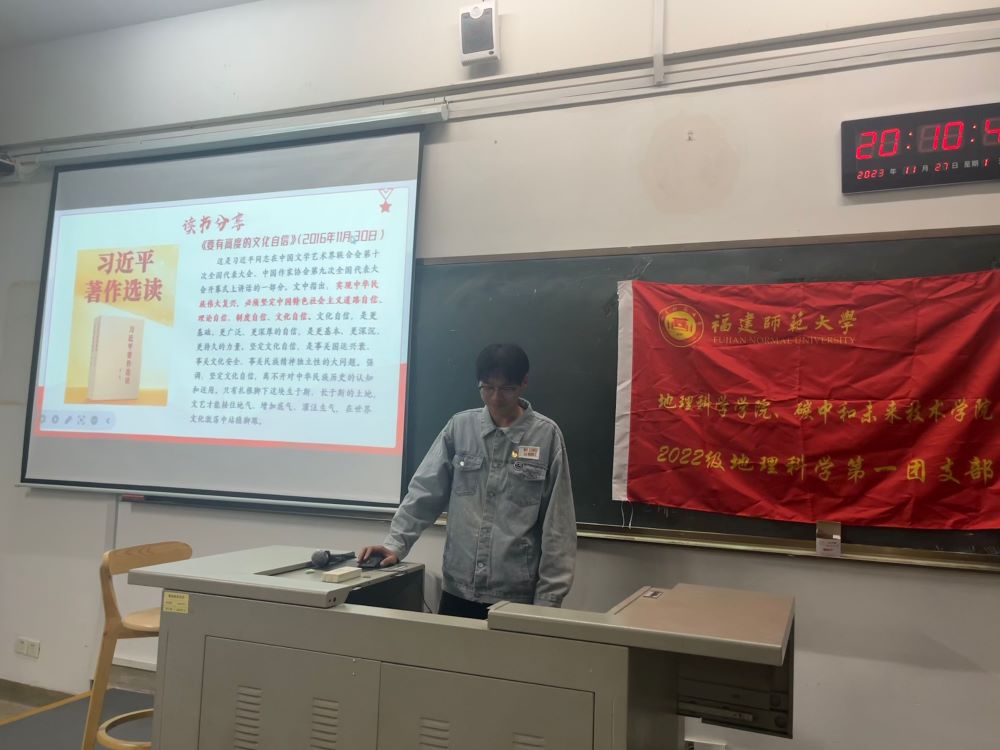 首先,團支書黃靈銘帶領支部成員們閱讀《習近平著作選讀》,并和支部成員們交流這一經典著作當中的部分重要觀點。習近平指出:“中華民族生生不息綿延發展、飽受挫折又不斷浴火重生,都離不開中華文化的有力支撐。中華文化獨一無二的理念、智慧、氣度、神韻,增添了中國人民和中華民族內心深處的自信和自豪。”習近平總書記親切寄語和殷殷囑托激勵著團支部成員。團支部成員們一致認為要把習近平總書記的重要講話精神貫穿和落實到生活學習中,牢記初心使命,樹立正確的理想信念,勇于追求夢想,不斷超越自我。