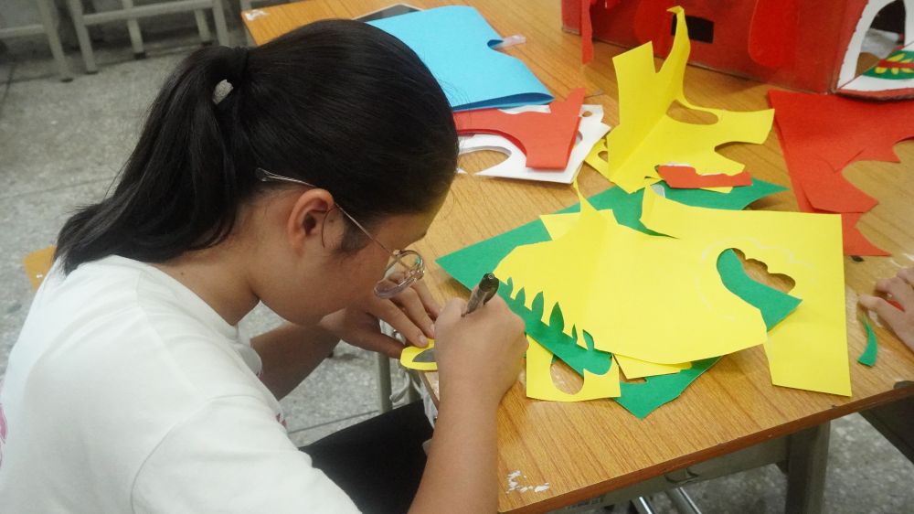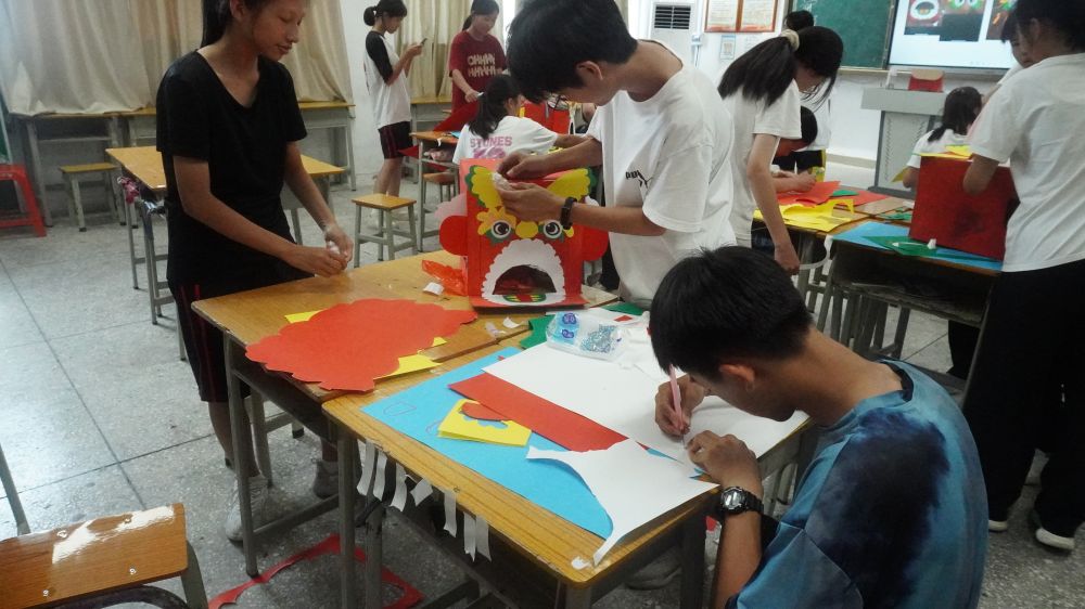 課堂伊始,賴鳳坤老師深入介紹了南北獅文化背景及其在中華民族傳統文化中的重要地位,并引導同學們積極討論了南獅與北獅的外形差異和表演特點,加深對獅舞文化的理解。隨后,同學們分組開始了美工醒獅的制作。從涂色、繪圖到裁剪、粘貼,同學們在制作過程中不僅鍛煉了動手能力和團隊協作精神,更在實踐中培養了他們對美的感受力和創造力。課程結束時,賴鳳坤老師表示:“我們希望通過這樣的課堂,讓學生們在實踐中感受傳統文化的魅力,激發他們對獅舞文化的興趣和熱愛,同時培養他們的文化自信與創新能力。”