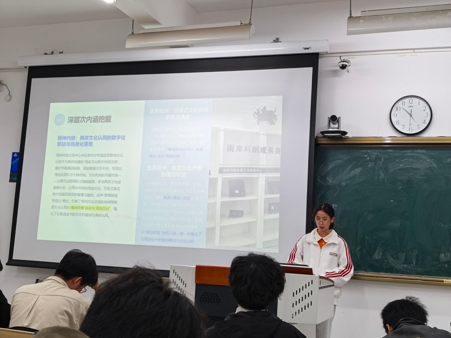 “閩院獻智百戰鋪程”分享會在校內順利舉行,各調研小組以PPT形式展示成果,結合訪談片段、企業實拍視頻還原調研過程,圍繞“如何提升兩岸青年科創合作意愿”“高校在科創融合中的角色定位”等議題展開激烈討論。楊金發老師受邀點評,肯定了學生提出的“建立兩岸青年科創導師庫”“打造跨境創新孵化平臺”等建議的可行性,并提出“認知、態度、意識、個性”八字閩臺合作重點,為團員們提供了更系統的指導。