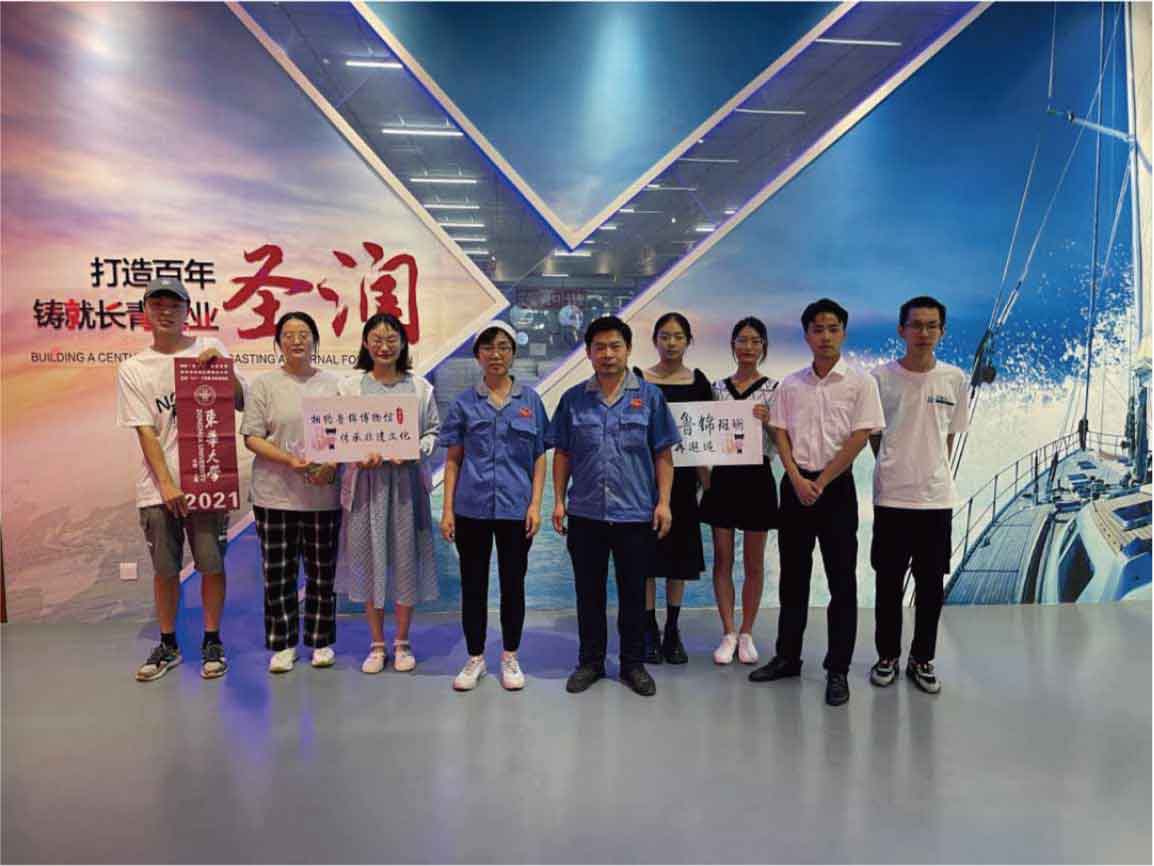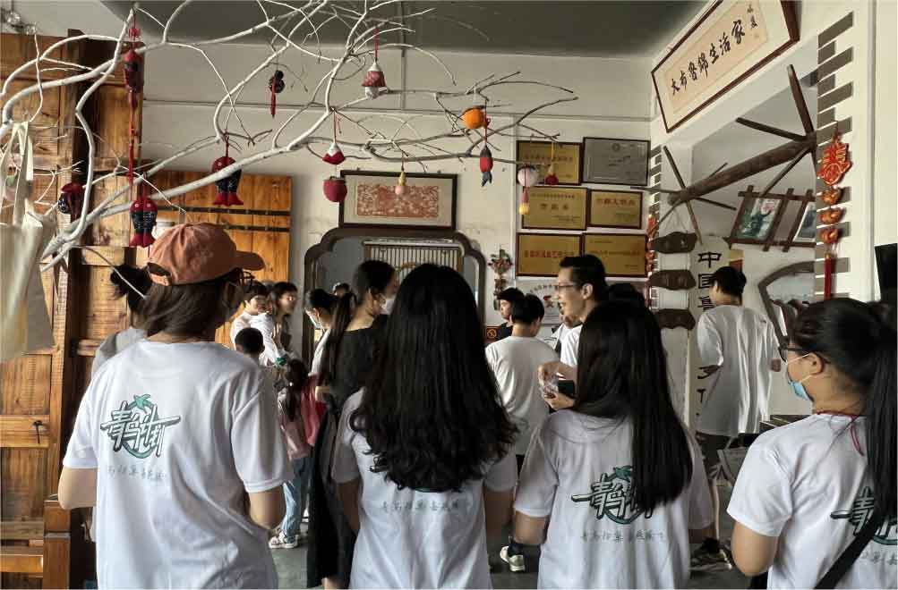 郝館長與趙奶奶向實踐團成員展現了魯錦獨有的溫度與底蘊,而魯錦在當下時代的發展,與當地的黨建文化及鄉村振興內容密不可分。在臥龍山街道團委書記李自輝的帶領下,實踐團成員參觀了鄉村振興館、黃崗村村史館及當地龍頭企業圣潤紡織集團,學習了“黨建+傳統文化”特色品牌,看到以支部為引領、黨員為帶動、全民參與為支撐、傳統文化為載體的“四位一體”治理模式。