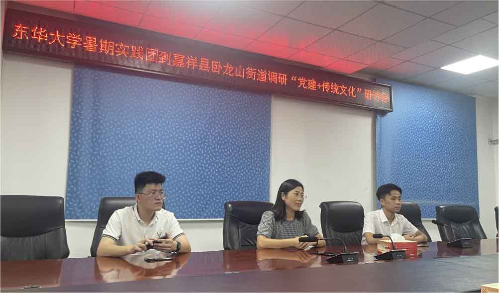 活動結束之后,實踐團應邀到臥龍山街道舉行研討會,街道為民服務中心曹建麗代表街道黨工委、辦事處向同學到來表示熱烈歡迎,就非遺文化的傳承問題對同學們寄予了殷切的希望,也希望以此次社會實踐活動為契機,能夠與東華大學進行密切合作,結合東華大學紡織學科優勢,共同建立校地企三項合作關系,在嘉祥設立東華大學或東華大學外語學院實踐基地,促進各方人員溝通往來,更好的將非物資文化遺產傳承下去。