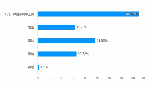 調研發現,大部分“00后”大學生希望朋輩心理輔導通過QQ、微信等網絡工具開展,其比例高達80.33%,其次是通過面談的方式,占比為45.63%,而寫信和電話則分別占28.69%和29.78%。