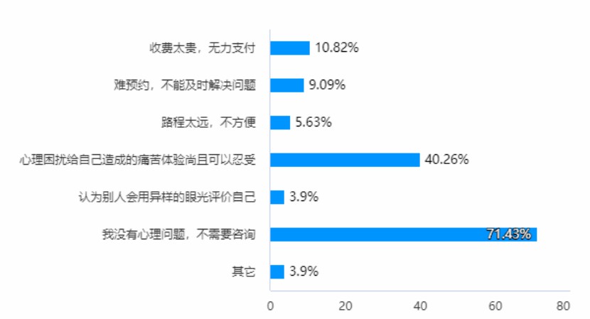 對于沒有接受過專業心理咨詢同學,他們所反映的原因除了“沒有心理問題,不需要咨詢”外,最常見的分別是“心理困擾給自己造成的痛苦體驗尚且可以忍受”(占40.26%),“收費太貴,無力支付”(占10.82%)和“難預約,不能及時解決問題”(占9.09%),此外,也有“路途遠”、“擔心異樣眼光”等擔憂。