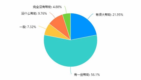 在心理咨詢與治療方面,只有14.09%的大學生表示曾接受過專業的治療和咨詢。在這部分同學中,有56.1%的同學認為專業心理治療“有一部分幫助”,21.95%的同學認為“有很大幫助”,也有14.64%的同學感到幫助非常少甚至幾乎沒有幫助。