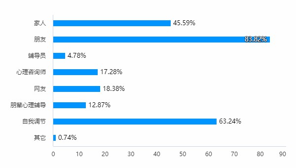 問卷結果顯示,在傾訴對象的選擇上,大學生更喜歡自我調節(占63.24%)或向朋友傾訴(占83.82%),緊接著向家人傾訴(占45.59%)。向心理咨詢師、朋輩輔導員或是網友傾訴的同學占比都在15%左右,占比中最低的是向輔導員老師傾訴,僅占比4.78%。