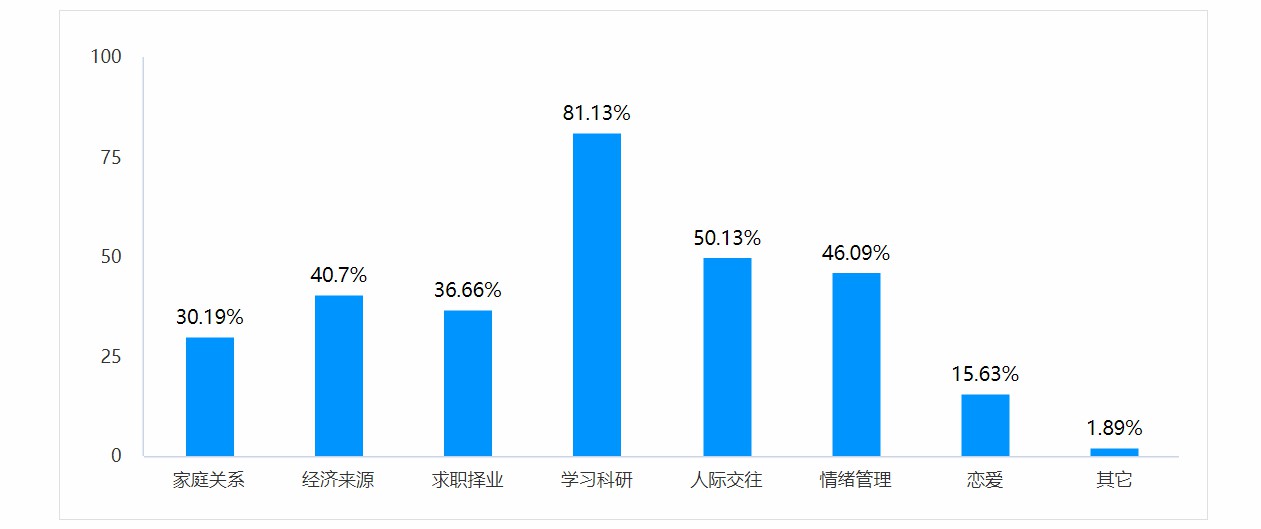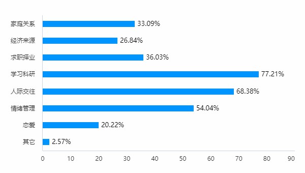 總體上,學習科研是壓力的最主要來源(82.96%),其次是人際交往(56.79%),接著是情緒管理(53.09%),隨后依次是經濟來源(48.15%)、求職擇業(46.91%)、家庭關系(35.80%)、戀愛(17.28%)。