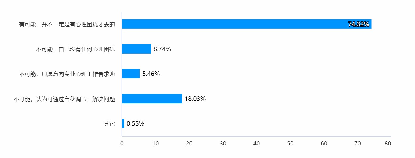 通過調研可以發現,如果校內搭建朋輩心理輔導平臺,大約74.32%的學生有可能求助于朋輩輔導員,但并不一定是有心理困擾才去。這說明大部分“00后”大學生愿意求助于朋輩輔導員,但求助的原因不一定是心理困擾,也有可能是其他原因,比如傾訴煩惱、緩解壓力等。而不可能求助于朋輩輔導員的學生中,部分認為自己沒有任何心理困擾,比例僅為全體受調查學生的8.74%。還有18.03%的學生認為可以通過自我調節來解決問題。5.46%的學生只愿意向專業心理工作者求助,這說明了學生對校內朋輩輔導員仍然存在擔憂。由此可知,“00后”大學生絕大多數存在著不同程度的心理壓力和心理困擾,并且大部分學生有意愿進行心理輔導。