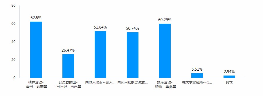 面對壓力,大多數大學生擁有自己的應對措施。62.5%的大學生會進行精神活動來排遣壓力,如看書、歌舞等。60.29%的大學生會選擇娛樂活動,如購物、美食等。由此看來,大多數大學生的壓力排遣方式偏向轉移注意力、娛樂放松等的形式,呈現“休整好后整裝再出發”的狀態,而非直接面對、解決。有51.84%的大學生會選擇向他人傾訴,選擇外向的壓力傾瀉方式,尋求家人、朋友的幫助、支持、鼓勵。而有50.74%、26.47%的大學生分別選擇了“內化、默默哭泣或憋在心里”、“記錄或輸出-寫日記、畫畫等”較為內向的壓力傾瀉方式,而前者的長時間累積容易造成心理問題。只有5.51%的大學生會選擇尋求專業幫助,由此看來,普及心理咨詢任重道遠。