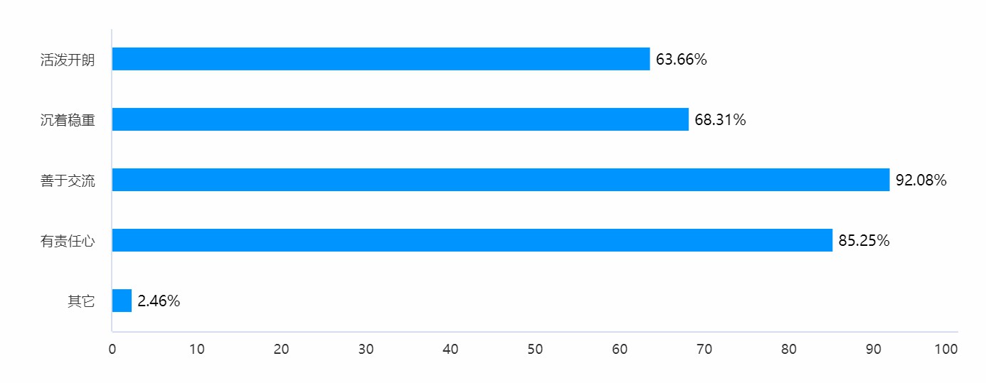 調研發現,絕大部分“00后”大學生認為一個好的朋輩輔導員應該善于交流,并且有責任心,占比分別為92.08%和85.25%。一半以上大學生認為朋輩輔導員應該活潑開朗(占比63.66%)、沉著穩重(占比68.31%)。