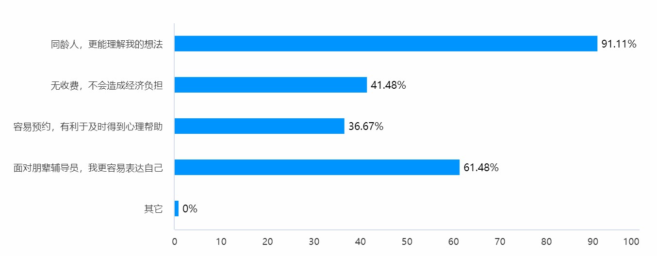 這部分數據反映出部分同學同樣存在心理困擾,但出于咨詢價格,步驟繁瑣或是認為自己尚能承受等原因并沒有嘗試接受咨詢。然而能承受并不意味著不需要心理咨詢,長時期的心理困擾也容易誘發情緒波動和一些心理疾病。對此校園內的朋輩心理輔導可以起到良好的幫助的作用,適當的傾聽與建議可以緩解這些未被特別重視的心理困擾,防止其不斷累積造成困擾。并且,對于朋輩心理輔導而言,心理咨詢的門檻被大大降低了——朋輩心理輔導無收費且容易預約,且在線上進行更加便利靈活,保密措施也可以緩解學生們對于隱私的擔憂。