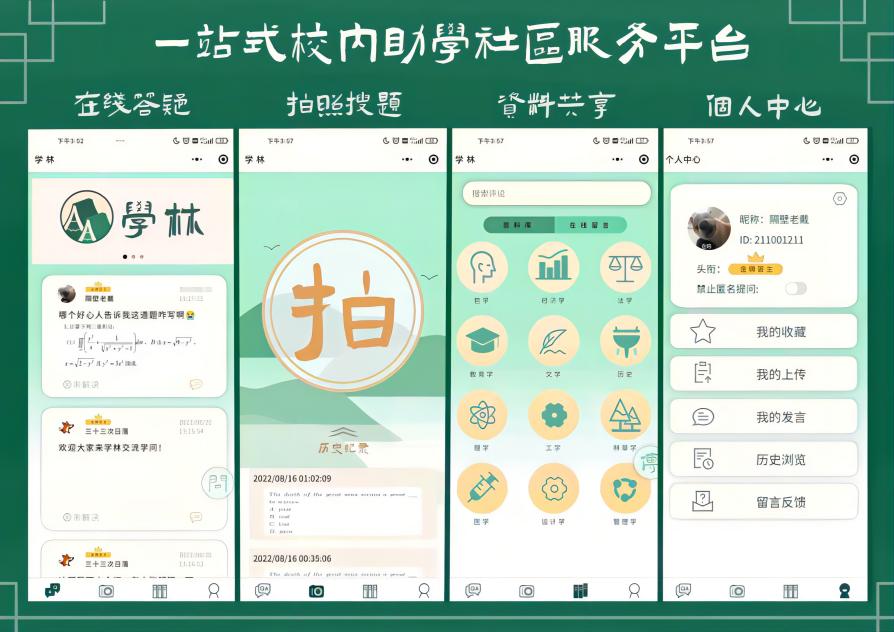 “學林6.0”已實現的功能有:用戶可通過掃碼進入小程序測試版,并以北京林業大學學號為賬號進行認證登陸;用戶可在在線答疑模塊選擇匿名或非匿名發布問題,問題支持附帶圖片與視頻文件發布,并可選擇邀請好友來回答問題,也可回答其他用戶提出的問題,所有用戶的問題與留言都實時公開,并可以收藏和點贊,若用戶問題得到解決,可自主勾選已解決;拍照搜題模塊可以通過拍照或圖片庫選擇兩種方式上傳題目,隨后小程序會將在數據庫中搜索到的類似問題的答案反饋給用戶,此模塊還可顯示拍照搜題的記錄;在資料共享模塊,用戶可以按學科類別向數據庫中上傳各種類型文件,也可下載其他用戶上傳的文件,并附帶留言區,可以留言求助其他同學獲取資料;在個人中心模塊,用戶可以更改昵稱、頭像、密碼、選擇是否禁止向我提問、注銷賬戶、查看我的收藏、我的上傳、我的發言、歷史瀏覽記錄、以及留言反饋。