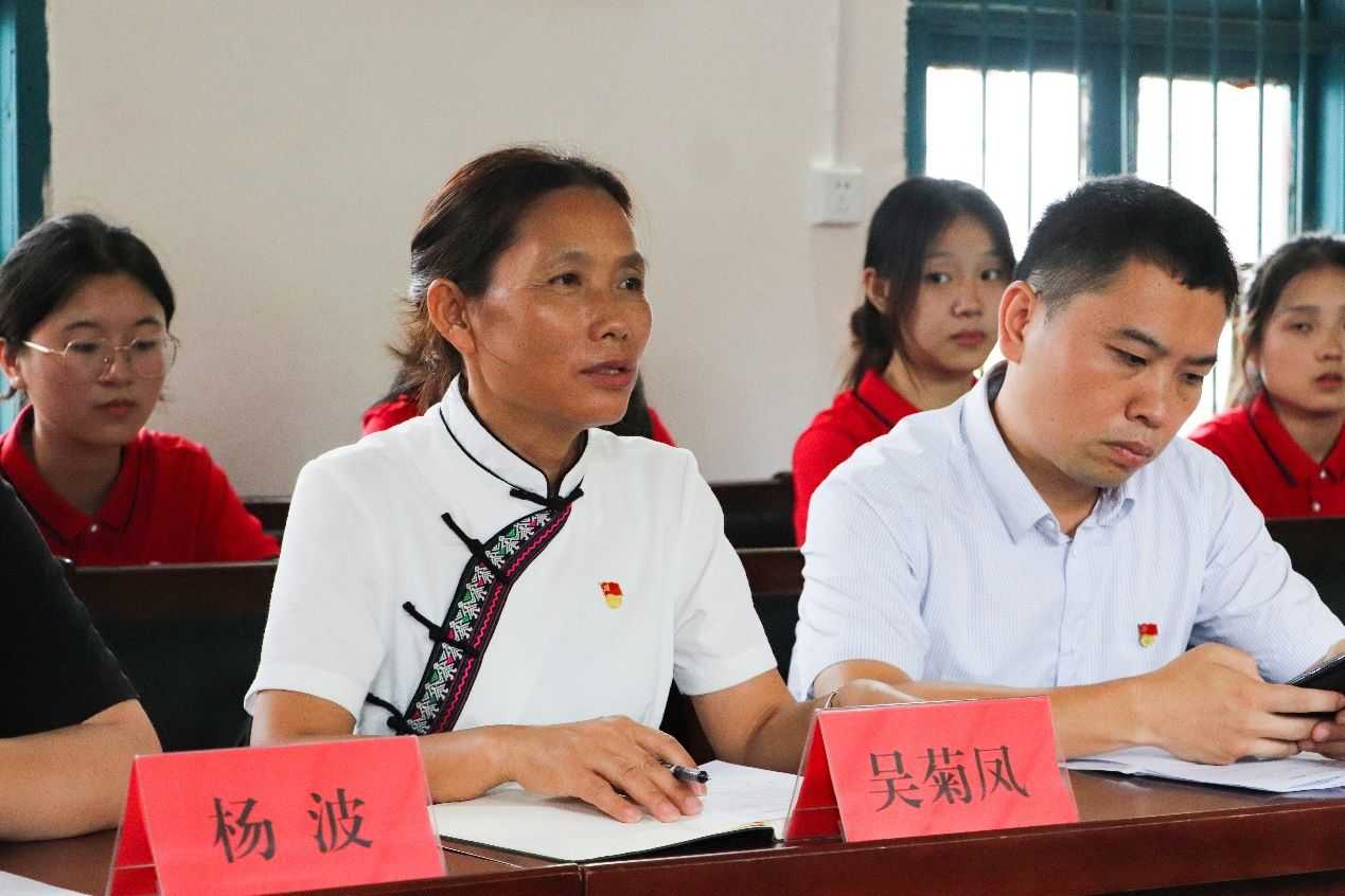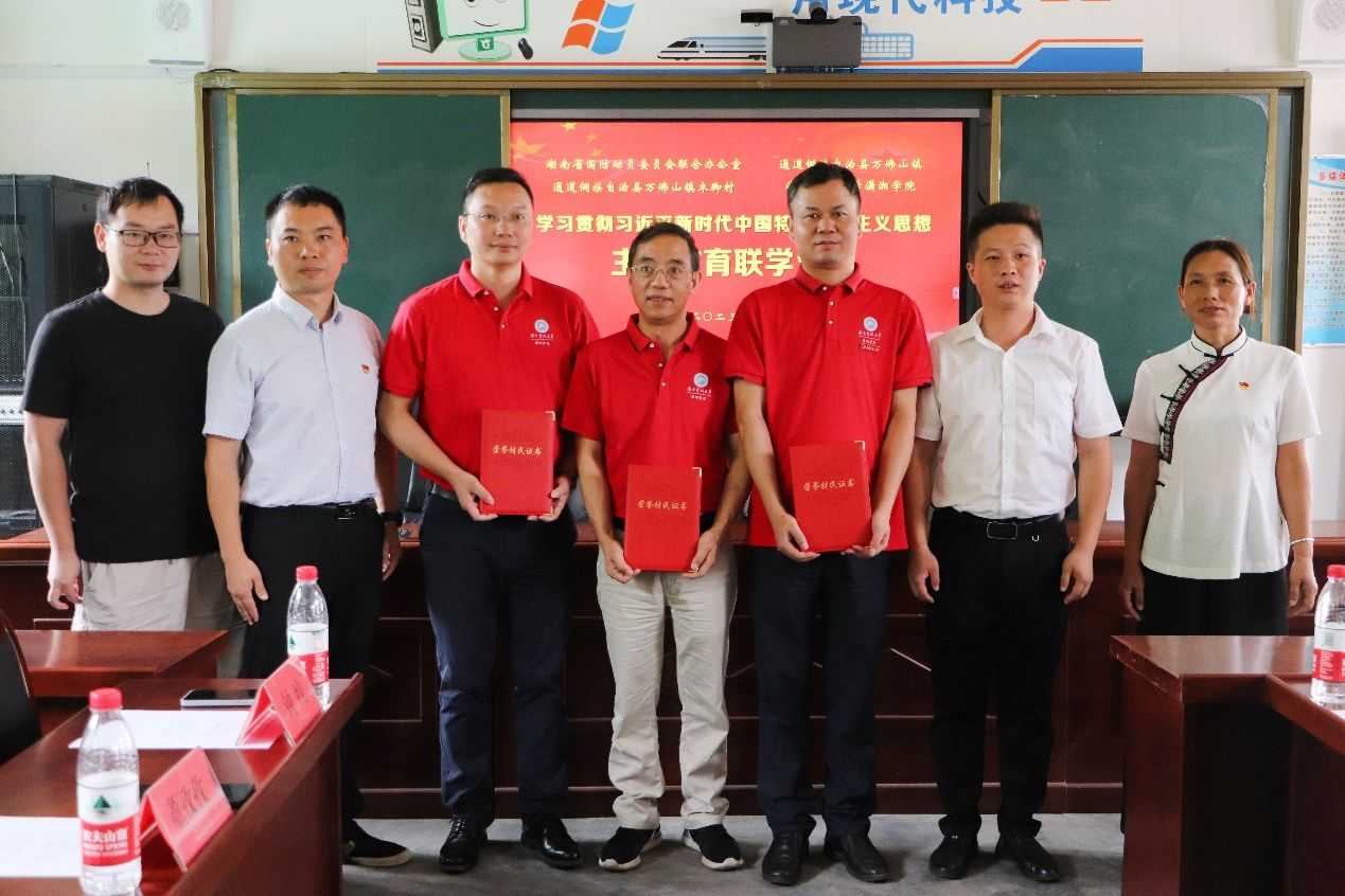為大力弘揚愛國精神,增強全民國防意識,牢固樹立為國防奮斗獻身的責任感和使命感,7月8日上午,湖南科技大學瀟湘學院聯合湖南省國動辦駐村工作隊、萬佛山鎮黨委、木腳村總支在木腳完全小學多媒體會議室開展“學習貫徹習近平新時代中國特色社會主義思想”主題教育聯學活動。瀟湘學院黨委書記廖雙紅、正處級干部周光明、黨委副書記葉軍、學工辦主任董孜孜及省國動辦駐木腳村第一書記王成、萬佛山鎮黨委副書記向軍軍、黨委委員楊波、木腳村黨總支書記吳菊鳳等蒞臨會場,瀟湘學院“青年紅色筑夢之旅”實踐團師生成員參會學習。本次會議由向軍軍主持。