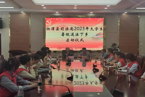 7月13日上午9時(shí),湘潭縣司法局四級(jí)調(diào)研員劉新群、譚家山鎮(zhèn)黨委副書記朱建國于譚家山鎮(zhèn)人民政府主持“2023年暑期大學(xué)生暑期送法下鄉(xiāng)”啟動(dòng)儀式,志愿者團(tuán)隊(duì)以及司法局、政府部門相關(guān)人員到場參加儀式。儀式中,作為司法部門代表,劉新群調(diào)研員強(qiáng)調(diào):“加強(qiáng)法制化建設(shè)是鄉(xiāng)村振興必不可少的進(jìn)程,大學(xué)生暑期送法下鄉(xiāng)活動(dòng),為普法進(jìn)程的推進(jìn)注入了青春活力。”會(huì)議議程接近尾聲,朱副書記宣布2023年暑期大學(xué)生暑期送法下鄉(xiāng)活動(dòng)正式開始。