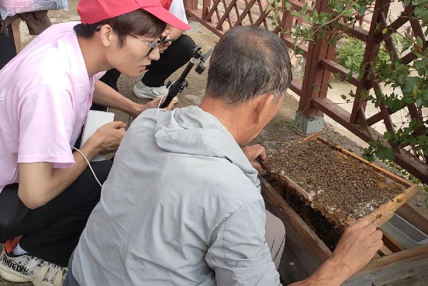 圖為養蜂基地大叔向實踐隊員講解蜜蜂養殖技術。