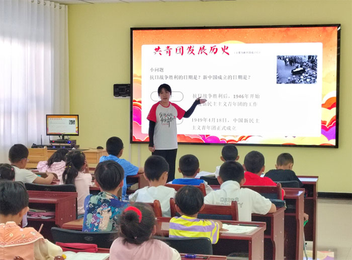 考慮到本地的教育水平和學生的學習能力差別,社會實踐小隊成員統籌安排,針對6-12歲小學生群體,圍繞團史知識、語言文化兩個主題,精心設計了對應的課程內容,做到生動有趣,易于理解,為孩子們帶來了別開生面的課堂體驗。