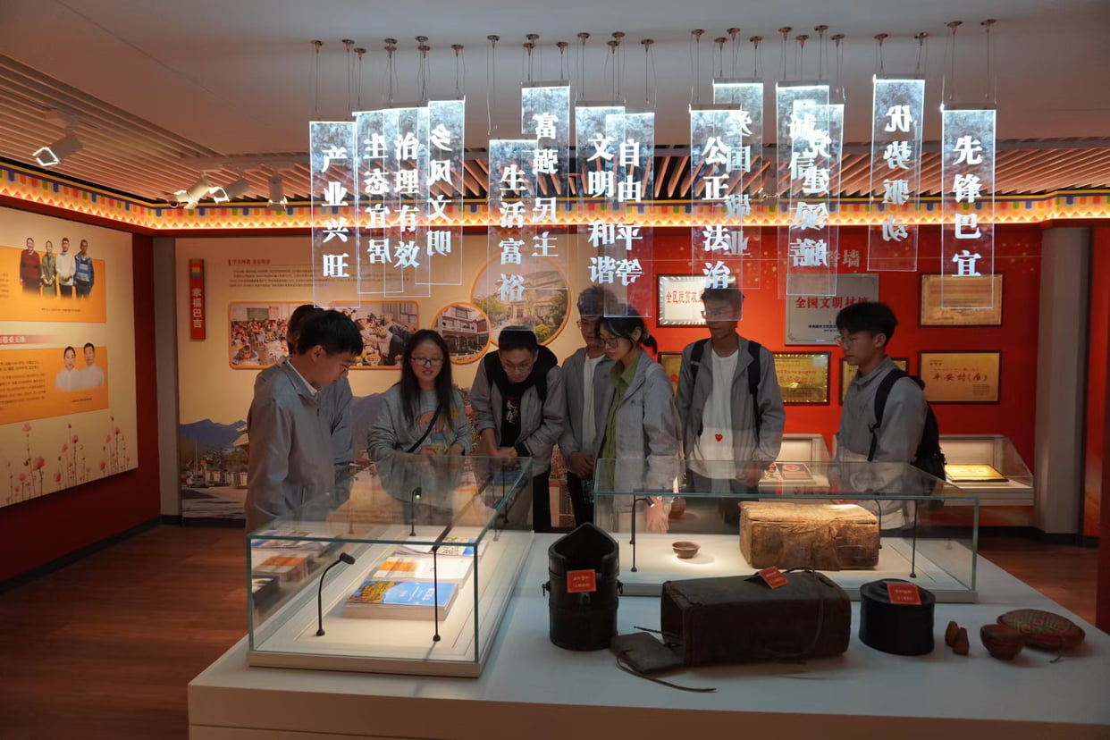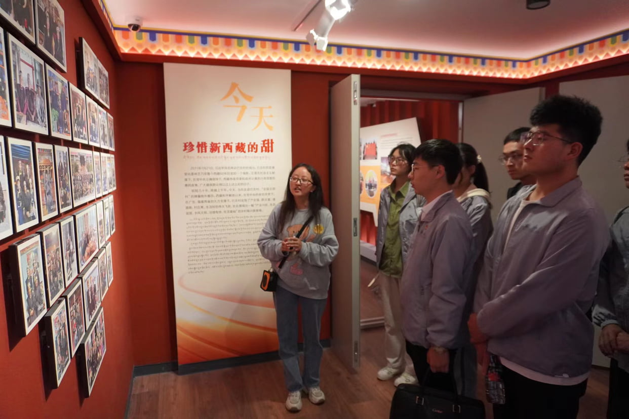 圖為工作人員向團隊介紹“今天珍惜新西藏的甜”展覽館。通訊員 徐赫岑 攝