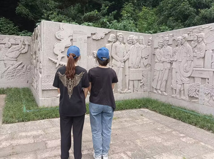 紀(jì)念碑的兩側(cè)鐫刻有許多的壁畫(huà),上面記錄了先烈們的颯爽英姿,生動(dòng)地刻畫(huà)了革命烈士們?yōu)榇龠M(jìn)國(guó)家統(tǒng)一、保護(hù)國(guó)土不受外來(lái)侵略拋頭顱、灑熱血的模樣。在欣賞壁畫(huà)時(shí),此時(shí)團(tuán)隊(duì)成員的腦海中浮現(xiàn)出先烈們?cè)谝鈿怙L(fēng)發(fā)的年紀(jì),選擇為了“大我”而犧牲“小我”,將個(gè)人生死置之度外的英雄形象,這樣的烈士值得吾輩青年永遠(yuǎn)敬佩!身處和平年代的青年,更應(yīng)以國(guó)家利益、集體利益為重,以積極昂揚(yáng)的姿態(tài)向新時(shí)代新的發(fā)展目標(biāo)砥礪前行,為實(shí)現(xiàn)中華民族的偉大復(fù)興而踔厲奮發(fā)!