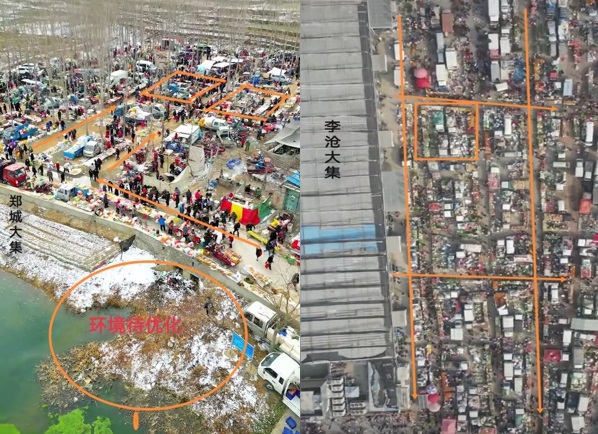 在布局設計上,要區分攤位類型,提供基礎設施,留出休息區域,以改善集市的整體環境和顧客的購物體驗。當前集市布局大多以輻射狀、線性、廣場型三種形式混合為主,造成了交通占道擁堵等問題。近年來相關部門對其進行了嚴格管控,占道情況明顯減少。