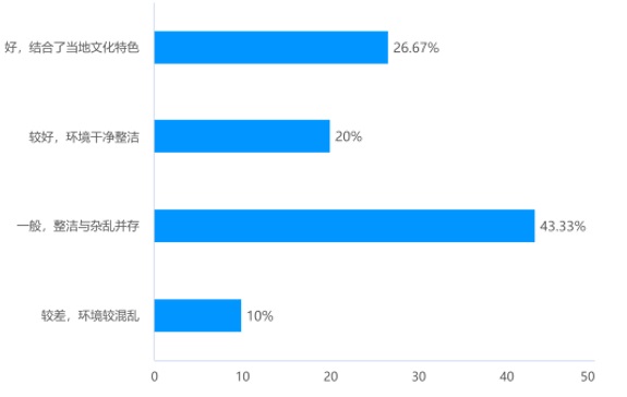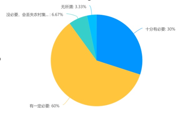 實踐團隊圍繞集市布局、管理制作了網絡調查問卷并進行發放,在回收的調查問卷中我們發現43.33%認為集市環境一般,整潔與雜亂并存,10%認為集市環境較混亂,其中高達90%認為有必要對農村集市進行統一規劃和現代化建設。