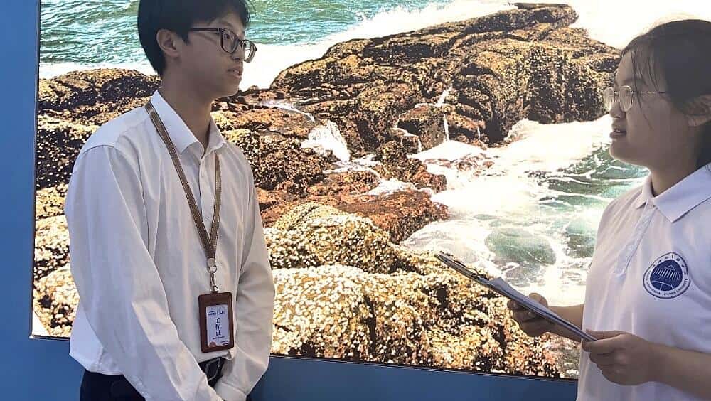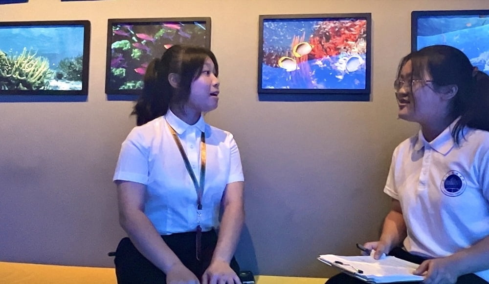 實踐隊員采訪海洋館工作人員工作人員介紹了島上多樣的生態(tài)系統(tǒng),以及島上保護區(qū)和海洋保護政策的推動,包括對海草床和珊瑚礁的保護,島上形成了一個強大的藍色碳匯,有效減緩了溫室氣體的排放。一系列環(huán)保措施的推動使島上生態(tài)得以可持續(xù)發(fā)展。