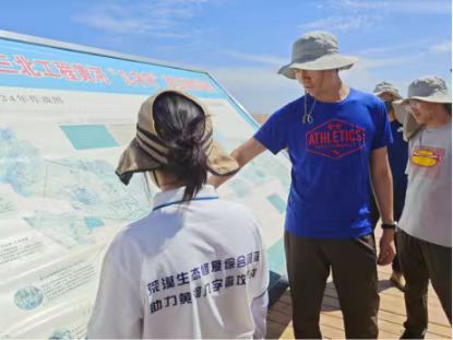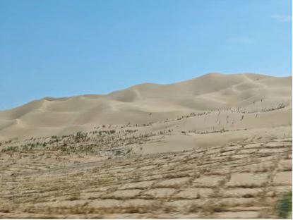 防風(fēng)固沙護生態(tài) 堅韌意志存心間。實踐團隊來到了納林套海。在這里,項目組向?qū)嵺`團隊講解了磴口縣三北工程黃河“幾字彎”攻堅戰(zhàn)作戰(zhàn)圖,以及磴口縣烏蘭布和沙漠東北緣防風(fēng)阻沙鎖邊林帶項目。項目的實現(xiàn)經(jīng)過了十年艱苦奮戰(zhàn),最終建成了一條長308華里,寬100米的大型防沙林帶。通過此次的參觀與講解,團隊成員深刻體會了“不畏艱難、負(fù)重前行、團結(jié)拼搏、敢于勝利、繼往開來、永不止步”的308精神,同時對西部荒漠生態(tài)治理的重要性有了更深的理解。返程時,團隊驅(qū)車穿越烏蘭布和沙漠,在此期間,團隊成員注意到,沙丘之間種植了大量的草方格和植被,用以固定沙土,防止沙漠化進一步擴展。同時團隊成員也發(fā)現(xiàn)沿途的沙地上已經(jīng)有不少新生的綠色植被,親眼看到了荒漠治理的方式和成果。