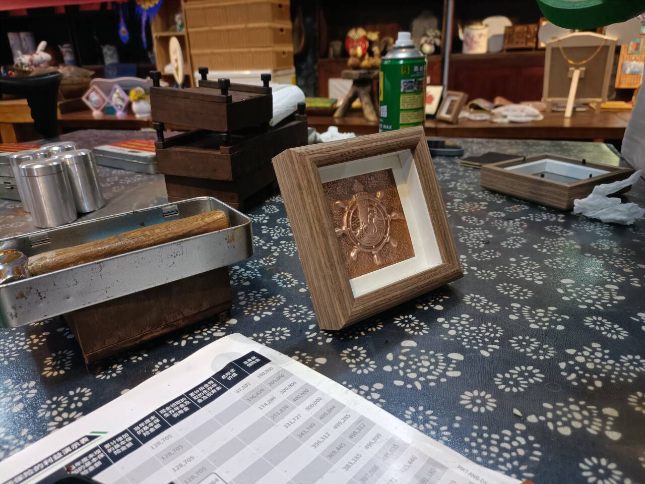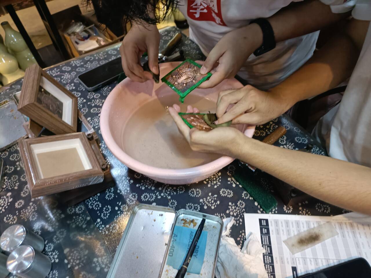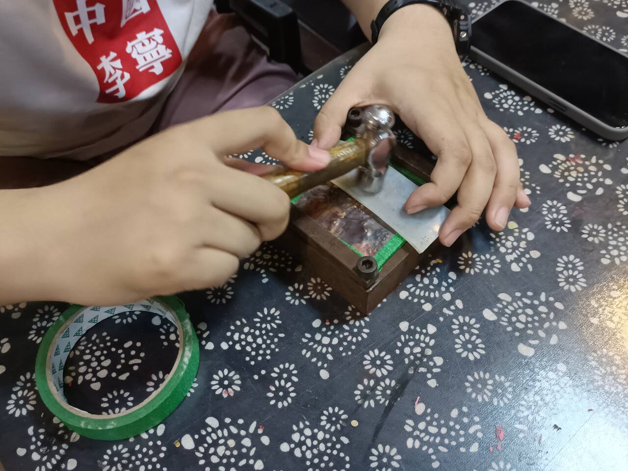團隊成員親自體驗了銅版畫的制作過程。首先是準備銅版,這一過程需要精確地打磨和拋光,使得銅版表面達到理想的平整度。然后,使用膠帶將銅板固定在鐵砧上,并用錘子墊在膠條上捶打。這一步驟的精度和技巧性十分具有挑戰性,每一次捶打都需要細致入微的控制力和對藝術的把控度。接下來是拋光環節,團隊成員學習了如何在銅版上進行拋光,并在銅板上打蠟。每一次拋光都要求準確的力度和一定的耐心,以確保最終做出高質量的作品。