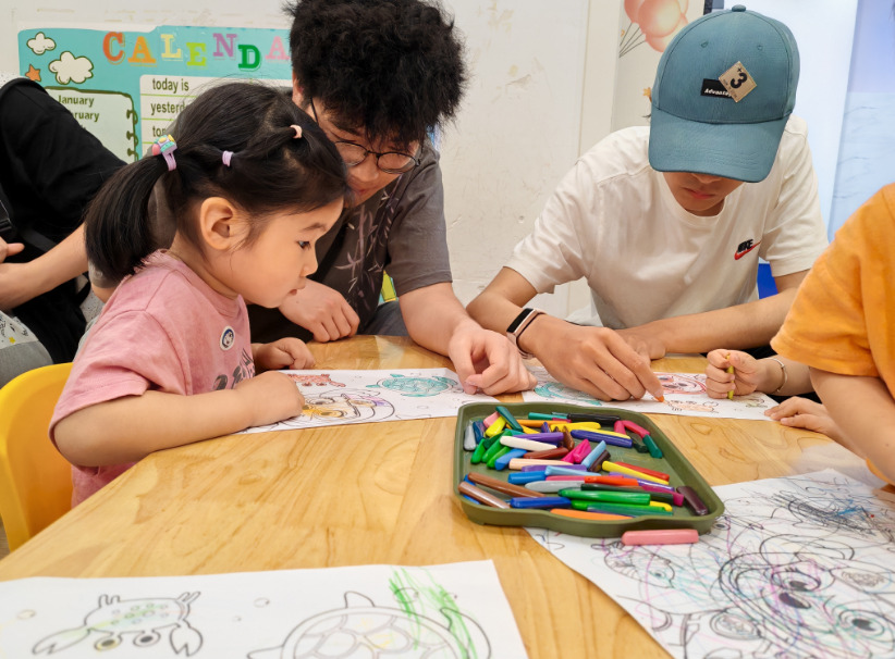 實踐隊針對不同年齡段的小朋友靈活運用教學策略。對低齡兒童,分發(fā)帶有簡筆畫的空白紙,引導他們用顏料自由創(chuàng)作,展現(xiàn)想象力。而對稍大孩子,教授折紙剪紙技巧,如精確剪下五角星,鍛煉手工能力。手工繪畫不僅啟蒙藝術,也極大促進兒童智力發(fā)展和身心成長,培養(yǎng)獨立思考、解決問題的能力,以及創(chuàng)意思維和開拓精神,這些經(jīng)驗將成為他們未來寶貴的財富。