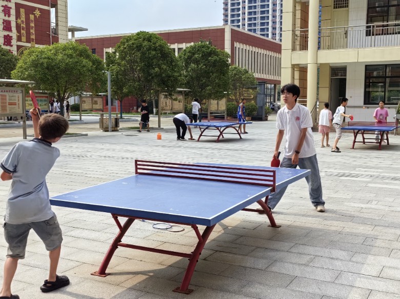 圖為志愿者與學生們在乒乓球臺上比拼球藝。柴灝明供圖