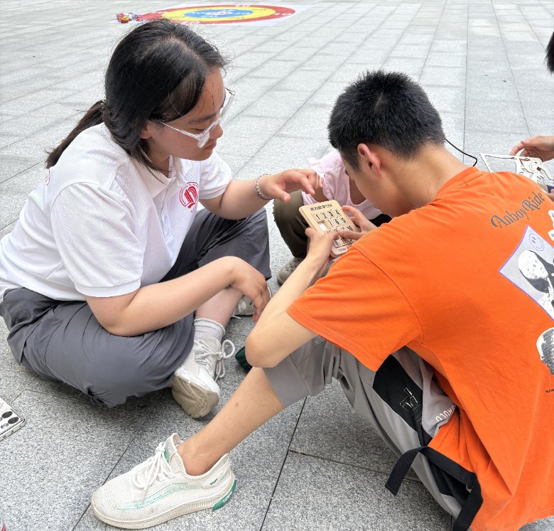 圖為志愿者給學生介紹數字華容道的基本玩法。 管明浩供圖