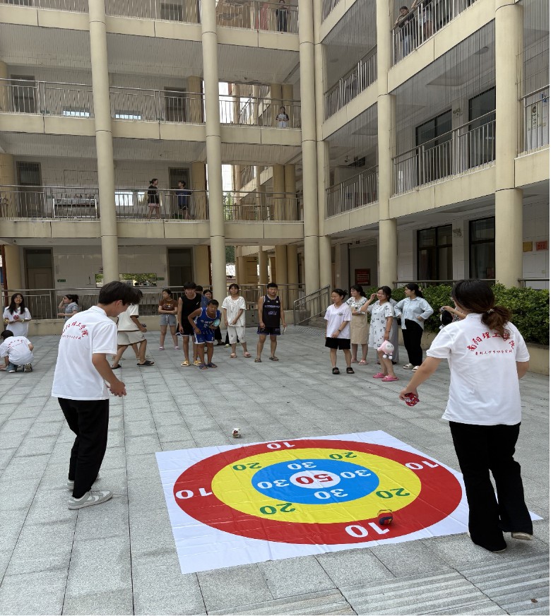 圖為志愿者與學生們做投擲沙包游戲。柴灝明供圖