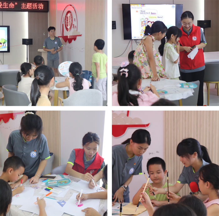 當日上午,隊員們立足鄉村教育現狀,結合外語系專業特色,為當地兒童精心策劃了一系列主題課程。在暑期防溺水安全教育課堂上,隊員們通過實況演練、案例講解、趣味搶答等形式,介紹了基本防溺水安全知識及應急技能;中英文閱讀課上,隊員們結合實用對話英語教學與趣味互動活動,讓孩子們在輕松氛圍中掌握日常英語表達;書法啟蒙課堂與繪畫啟蒙課堂同樣精彩紛呈,書法課上,在一撇一捺間,傳統文化的魅力悄然浸潤當地孩子童心;繪畫課上,孩子們在志愿者的引導下,用畫筆描繪心中的美好世界,五彩斑斕的畫作展現出他們天馬行空的想象力。