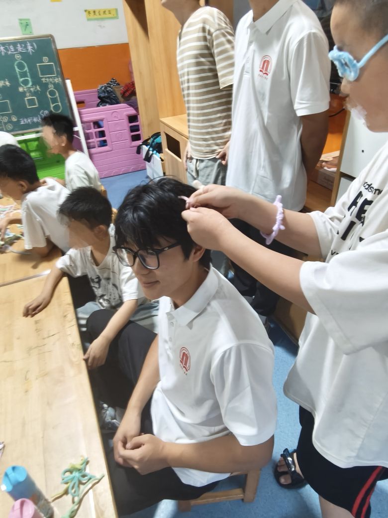 活動(dòng)中,孩子們用自己獨(dú)特的方式表達(dá)對(duì)志愿者的喜愛。有的孩子將自己完成的手工制品送給志愿者,有的則為志愿者佩戴上自己制作的小飾品,每一個(gè)舉動(dòng)都充滿了真誠(chéng)與溫暖。志愿者們也全身心投入,用鼓勵(lì)的話語(yǔ)和親切的笑容回應(yīng)著孩子們,讓他們?cè)谳p松愉快的氛圍感受到被關(guān)注和被關(guān)愛中。