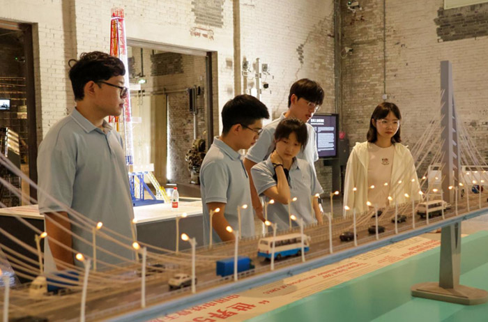 實(shí)踐隊(duì)成員在展館內(nèi)的橋梁結(jié)構(gòu)沙盤前展開討論