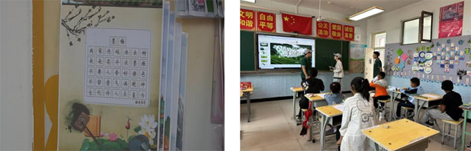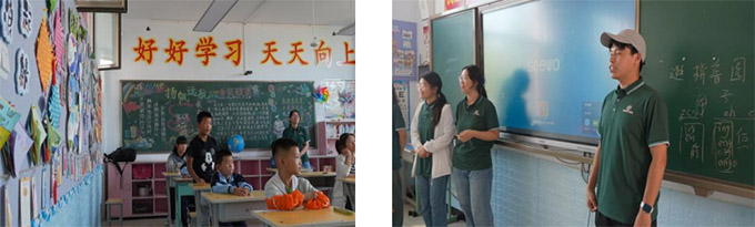 課堂是語言學(xué)習(xí)的主陣地,也是推普工作的核心場景之一。為了讓孩子們在輕松的氛圍中突破發(fā)音難點(diǎn),團(tuán)隊(duì)成員王藝然和施瑤瑤提前一周打磨教學(xué)方案和課堂,結(jié)合小學(xué)生的認(rèn)知特點(diǎn),制作了圖文并茂的PPT,將“前后鼻音區(qū)分”這一常見發(fā)音難題拆解為生動(dòng)的教學(xué)環(huán)節(jié)。