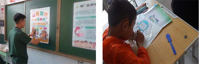 課堂之外,推普的快樂延伸到了更多角落。孩子們拿起畫筆,在扇子上繪制圖案填上顏色,還領(lǐng)到了空畫紙,要把對普通話的理解做成手抄報(bào)。團(tuán)隊(duì)成員于文歌給大家做示范。有人在扇子上畫了毛筆、荷花和燈籠,說“說好普通話就是傳承中國優(yōu)秀文化”;有人在手抄報(bào)上抄下課堂學(xué)的繞口令,特意標(biāo)上了前后鼻音的拼音;還有人畫了一群手拉手的小人,旁邊寫著“普通話讓我們成為朋友”。畫筆沙沙作響時(shí),推普的理念也跟著色彩一起,留在了扇面和畫紙上。