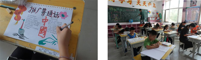 而另一邊,于文歌同學(xué)正帶著孩子們把書寫成果“搬”上黑板——繪制“學(xué)好普通話”黑板報(bào)。孩子們在下面嘰嘰喳喳的說著自己的意見,雖然沒有親手繪制,但每個(gè)細(xì)節(jié)都藏著他們的創(chuàng)意。從紙面書寫到黑板創(chuàng)作,鉛筆和粉筆成了連接語言與文化的橋梁。孩子們不僅在一筆一劃中學(xué)會了規(guī)范,更在涂涂畫畫里懂了:寫對一個(gè)字、畫好一幅畫,和說好普通話一樣,都是在守護(hù)這份生動(dòng)的文化。