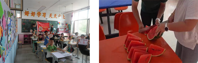(圖為小朋友帶獎(jiǎng)品合影)(圖為團(tuán)隊(duì)為小朋友切西瓜)