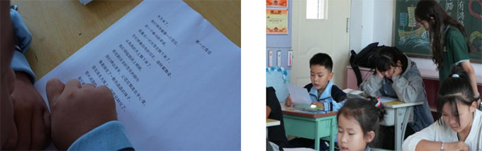 (圖為小朋友誦讀詩歌)(圖為萬怡然同學(xué)進(jìn)行糾音輔導(dǎo))