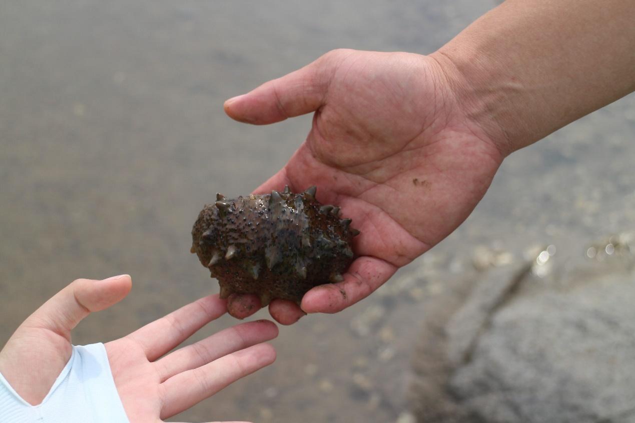 站在海岸邊,隊員們看到了村莊內排列整齊有序的大棚,村民介紹道,這是人工養殖的海參,搭建遮光大棚是為了保障海參的品質,使其能夠適應陸地的環境。由于野生海參生長在深海,所以大棚內要模擬深海的環境,大棚里面一片漆黑,只能依靠頭燈來觀察海參幼苗的生長。小海螺隊員在村民的熱情邀請下參與了捕撈海參的過程,看到手中碩大的海參,隊員們也是滿滿的收獲感,從村民講述自己家海參養殖的經歷中,也感受到了海參養殖的不易。走出養殖棚時剛好碰到岸邊漁民在打撈蛤蜊,堆放在船上的蛤蜊宛如一座低矮的小山丘。過去的幾百年釣魚嘴村都是靠出海打漁為生,收入很不穩定,如今,隨著海參養殖業的興起,家家戶戶養殖海參,不僅收入有了保障,還能夠保護海洋生態環境,充分響應了國家可持續發展的號召,在鄉村振興的時代背景下,釣魚嘴村的產業結構也發生了積極轉變。