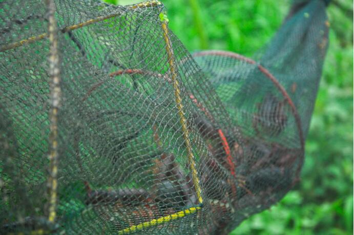 在學(xué)習(xí)了解小龍蝦的生活習(xí)性后,7月14日下午6點(diǎn),實(shí)踐成員與基地工作人員一起,進(jìn)行下地籠,為了將地籠穩(wěn)定在固定的位置,需要將地籠的一端捆綁一根竹竿,將竹竿插于泥土。7月15日早晨5點(diǎn)團(tuán)隊(duì)成員再次前往基地參與收地籠,借助昨天插入的竹竿將地籠從田中拉出。