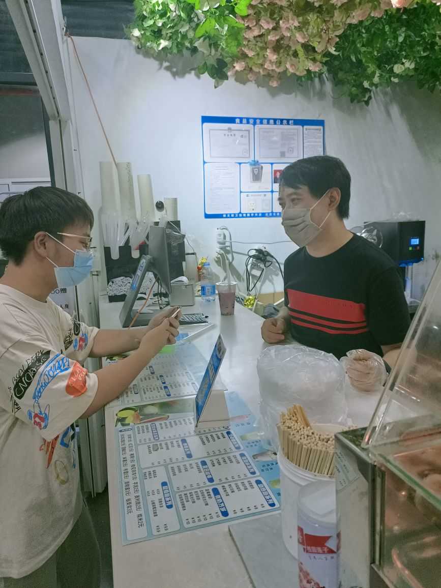 在大篩結束后,團隊成員前往一家奶茶店進行采訪,店老板非常熱情并且極為配合的接受了此次調查,店老板表示“即使疫情嚴重也不會影響自己開店的熱情。”而且他對于疫情防控工作也格外認真和上心,每位來店買飲品的客人在進店前都要掃場所碼,測量體溫并佩戴口罩,經過層層的“檢查”才可以進店挑選自己的飲品,在做核酸期間,老板也會非常積極響應的防疫工作,以身作則,早早排隊做完核酸后,為醫護人員送上免費的冰水,用自己的一份力量幫助防疫工作人員可以在空閑的時間得到有效的降溫,同樣也會對來到店里的每位顧客首先詢問做核酸的情況,如若是還未完成核酸采集任務,老板會讓其在等待的過程中先去做核酸。這件小事不僅能幫助疫情防控人員采集核酸的進度,同樣也會節省顧客自己的時間,顧客做完核酸再次返回時,單點的飲品也會早早的擺放在桌前。