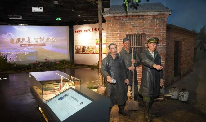 首先,實踐隊員于7月21日上午前往王家壩抗洪紀念館參觀。王家壩抗洪紀念館作為王家壩閘愛國主義教育示范基地重要組成部分,以中國共產黨領導下的淮河治理、抗洪搶險、抗災自救等重大歷史事件為背景,收藏各類珍貴圖片、文獻、實物、影像等2000余件,詳實記錄了蒙洼人民與洪澇災害英勇抗爭的艱辛歷程,結合講解員的介紹,隊員可以詳細了解到王家壩的歷史,“王家壩精神”的由來與內涵。紀念館里觸動人心的畫面、飽含真情的敘述,使人深受觸動。每當淮河抗洪進入危急的時刻,蒙洼蓄洪區人民群眾就會暫時離開自己生活勞作的家園,舍小家,為大家。而且無論是在王家壩的建設時期,還是在數次抗洪救災戰役中,黨員總是沖在第一線。不論是在辛苦艱難的建設工地、被洪水圍困的莊臺,還是抗洪搶險的堤壩,抑或是復耕復產、補種改種的田間地頭,都有黨員干部的身影。通過一幅幅圖片、一件件實物,重溫那段難忘的歷史,讓人們能夠更詳細地了解蒙洼人民長期以來與洪澇災害英勇抗爭的艱辛歷程,領悟了蒙洼地區黨員、干部、群眾不畏艱險、團結向上、甘于奉獻的優良作風,深刻理解了王家壩精神。