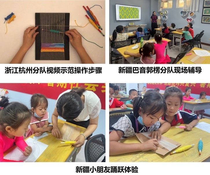 學校藝術設計專業(yè)的研究生娜仁來自蒙古族。當日,她身著一襲蒙古族坎肩,在新疆維吾爾自治區(qū)庫爾勒市迎賓路街道雅居社區(qū),組織巴音郭楞職業(yè)技術學院紡織服裝學院的學生及當地新疆巴音郭楞蒙古自治州庫爾勒市實驗中學、庫爾勒市第三小學、和靜縣第二小學的小朋友們一起參與千里之外的線上課堂,并悉心輔導現場小朋友們體驗經緯交織的奧秘和絲路紋樣的內涵。