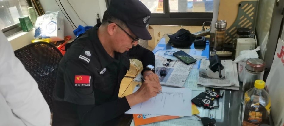 圖為龍鳳玫瑰園小區(qū)門衛(wèi)填寫防詐騙及消防安全調(diào)查問卷